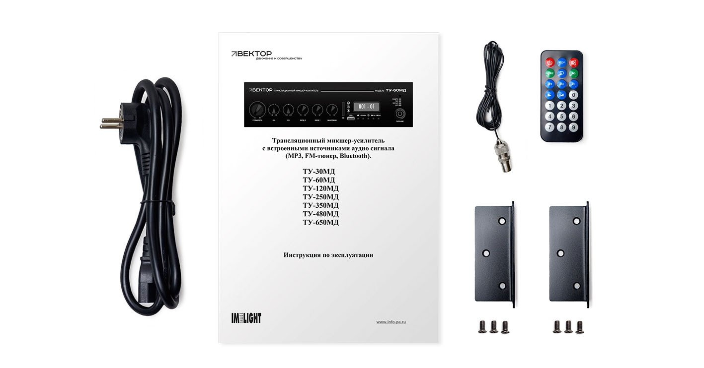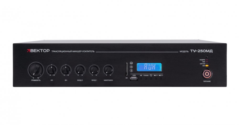 ВЕКТОР ТУ-250МД Комбинированный микшер-усилитель класс D. Мощность 250Вт. Выход 100 В\4-16 Ом, 1 микр и 2 AUX входа, 1 AUX выход. Цифровой FM тюнер, MP3 плеер, USB, SD, Bluetooth. Питание 220В. Рэковое крепление в комплекте.